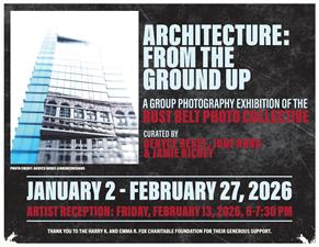 This group photography exhibition offers current perspectives on architecture, through the lens of the local artist. Over 40 pieces are on display, exploring design, politics, color and culture. The exhibiting artists are all members of Rust Belt Photo Collective, a community of regional photographers founded in Cleveland, Ohio. Architecture: From The Ground Up is curated by Denyce Renee, June Hund and Jamie Richey. Celebrate this exhibition and its local photographers at an artist reception on Friday, February 13, 2026 from 6pm-730pm. Free.