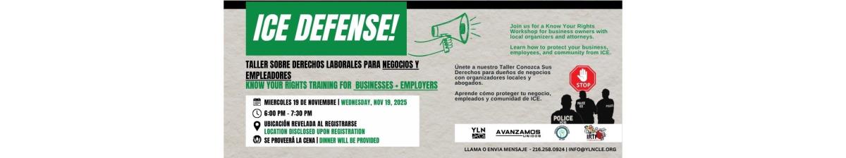 Join the Northeast Ohio Worker Center, Young Latino Network, and IRTF for an ICE Defense and Know Your Rights training for business owners and managers. Learn how to prepare your workplace, protect your employees, and respond confidently and lawfully if ICE shows up. Together, we can ensure that every business is safe, informed, and ready to stand up for its workers.